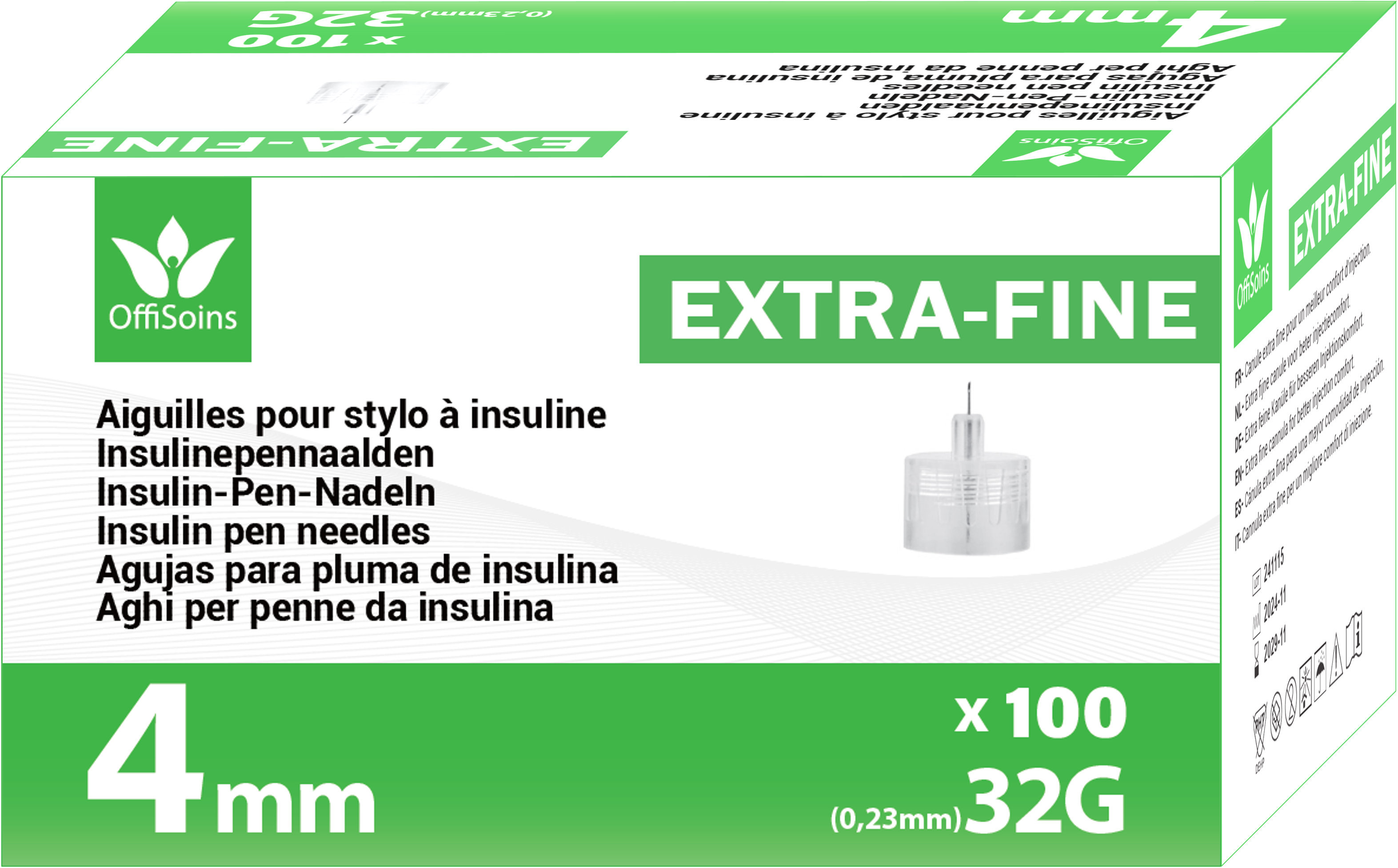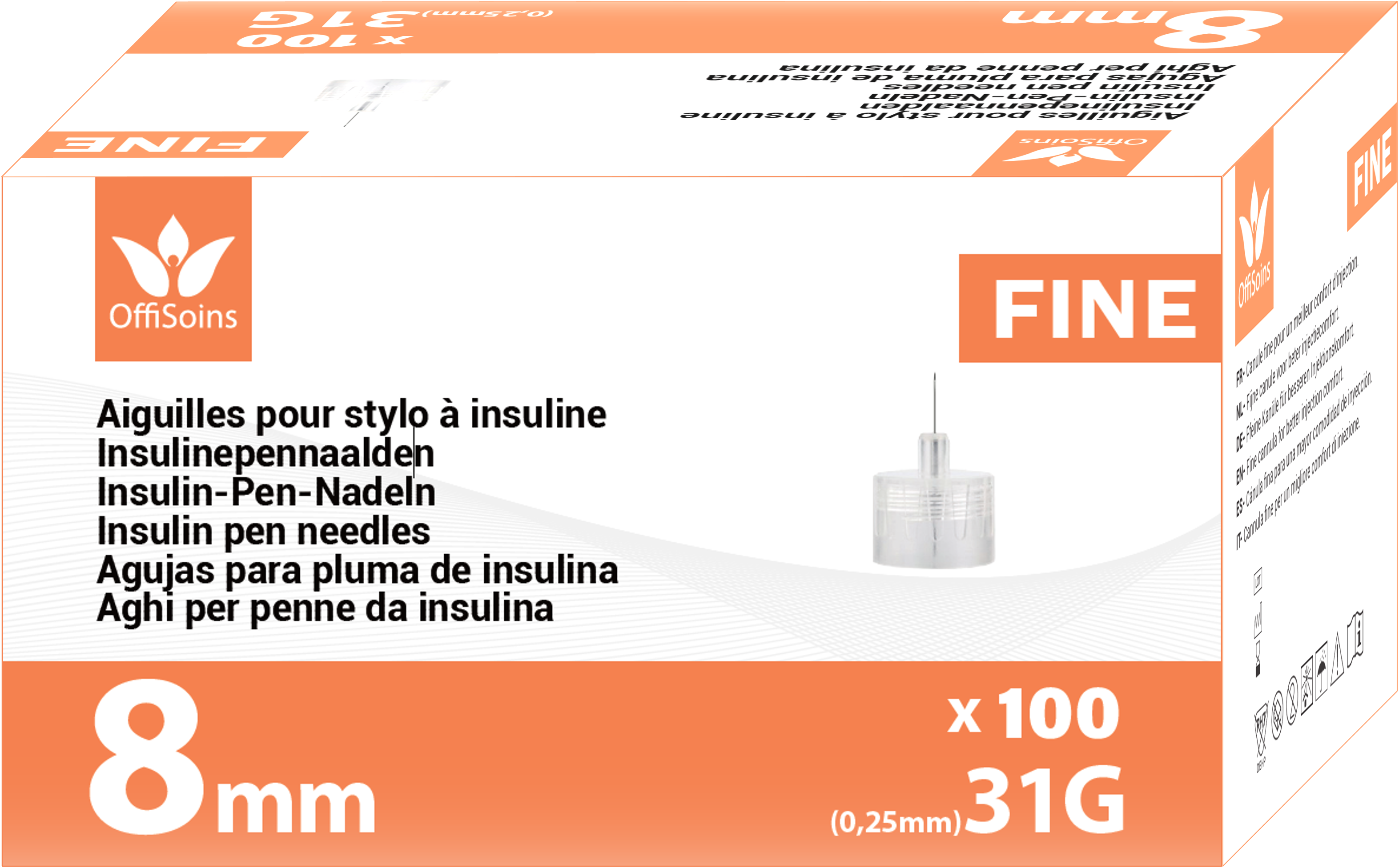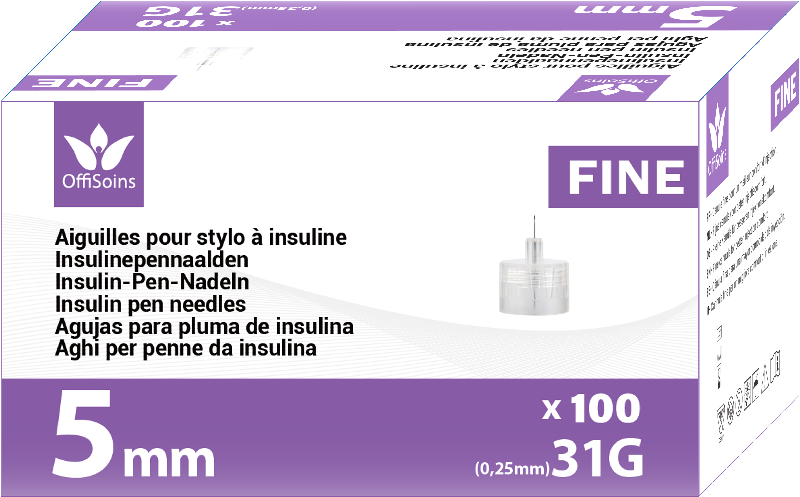 Diabète. Les aiguilles stériles pour stylo à insuline OffiSoins, sont spécialement conçues pour améliorer le confort lors de l'injection et minimiser la sensation de piqûre. Elles sont compatibles avec la plupart des stylos à insuline des grandes marques, et permettent une administration fiable et efficace de l'insuline.